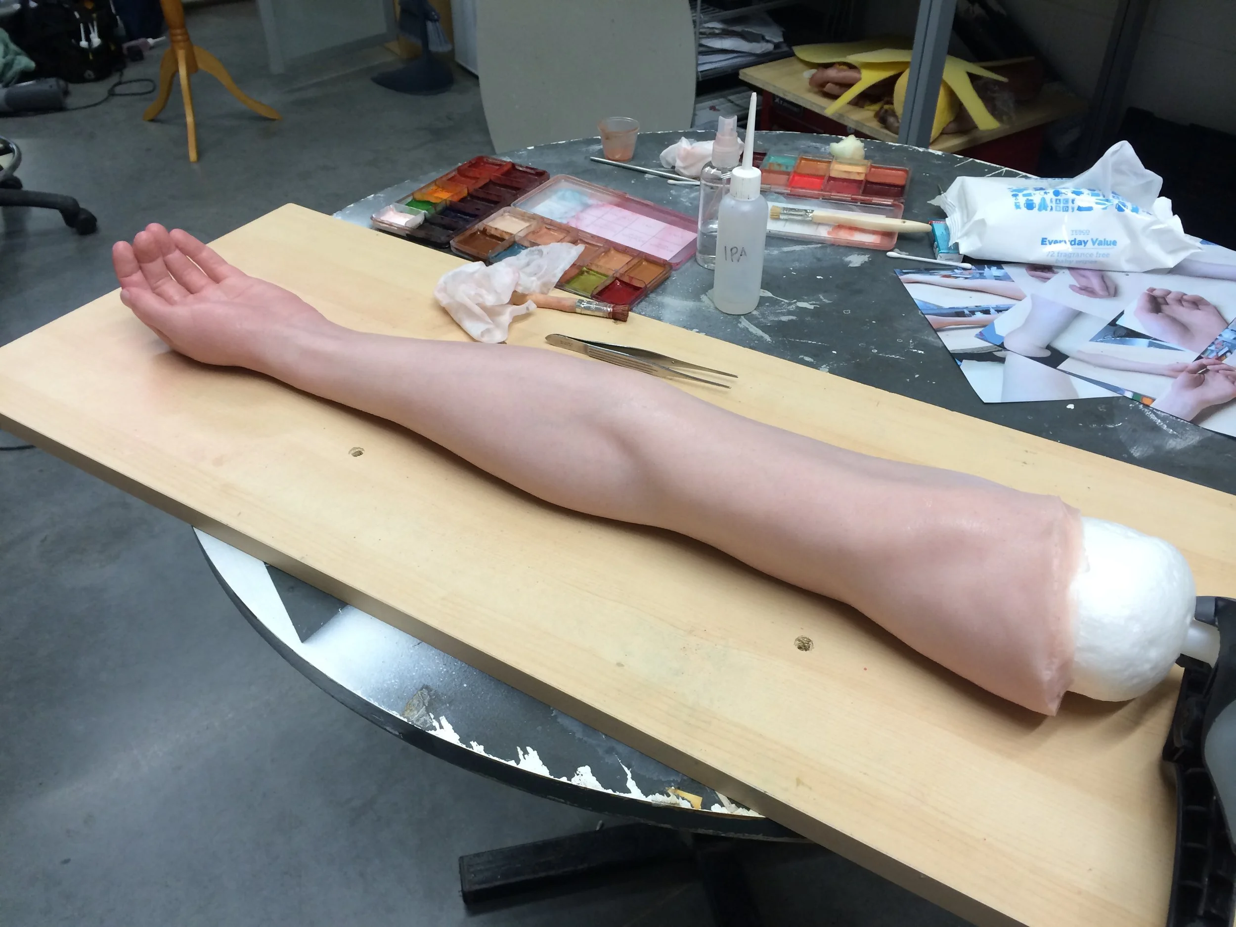 The model consisted of a bespoke realistic left arm made from soft silicone with skin layers (epidermis, dermis, fat and subcutaneous tissues) and all of the relevant structures including the brachial artery and the cephalic vein.